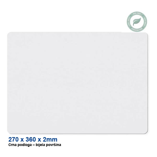 Bijeli gornji sloj podloge za miš lako se sublimira u ravnoj toplinskoj preši. Podloga se može personalizirati za kupce sublimacijom. Prikladan i zabavan proizvod za ponudu kao foto proizvod.