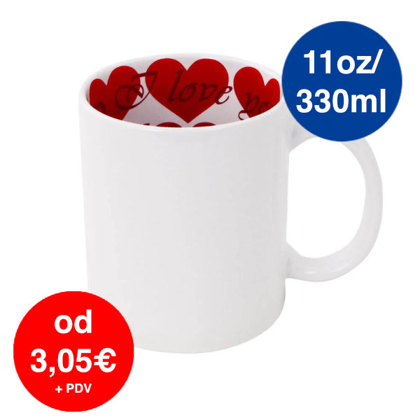 Keramička "Love" šalica kapaciteta 11oz / 330 ml spremna je za sublimaciju. Unutrašnjost je ukrašena Love motivima, a zahvaljujući prozirnom polimernom premazu vanjska strana može se personalizirati fotografijom, slikom ili tekstom – savršen poklon za godišnjice i posebne prigode.