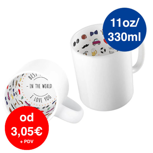 Keramička šalica Father kapaciteta 11oz / 330 ml spremna je za sublimaciju. Unutrašnjost je ukrašena natpisom Best Father In The World, a zahvaljujući prozirnom polimernom premazu vanjska strana može se personalizirati fotografijom, slikom ili tekstom – idealan poklon za Dan tate ili rođendan.
