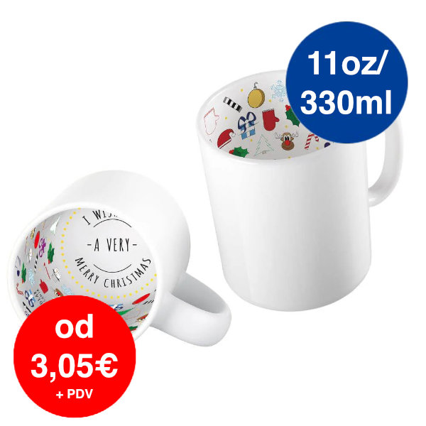 Keramička "Christmas" šalica kapaciteta 11oz / 330 ml spremna je za sublimaciju. Unutrašnjost je ukrašena božićnim motivima Merry Christmas, a zahvaljujući prozirnom polimernom premazu vanjska strana može se personalizirati fotografijom, slikom ili tekstom – savršen poklon za ispod božićnog drvca.
